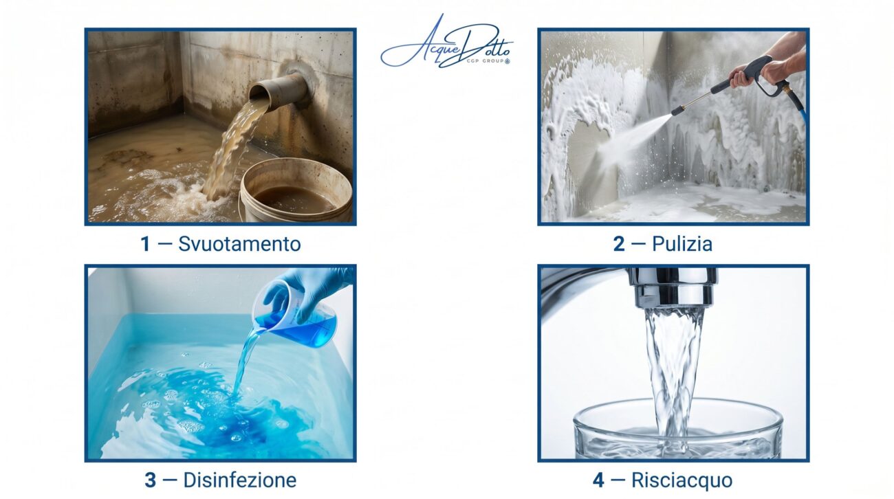 Pulizia meccanica: le pareti interne vengono pulite con idropulitrice ad alta pressione per rimuovere biofilm, incrostazioni e sedimenti. Senza questa fase, la sola disinfezione chimica è insufficiente.