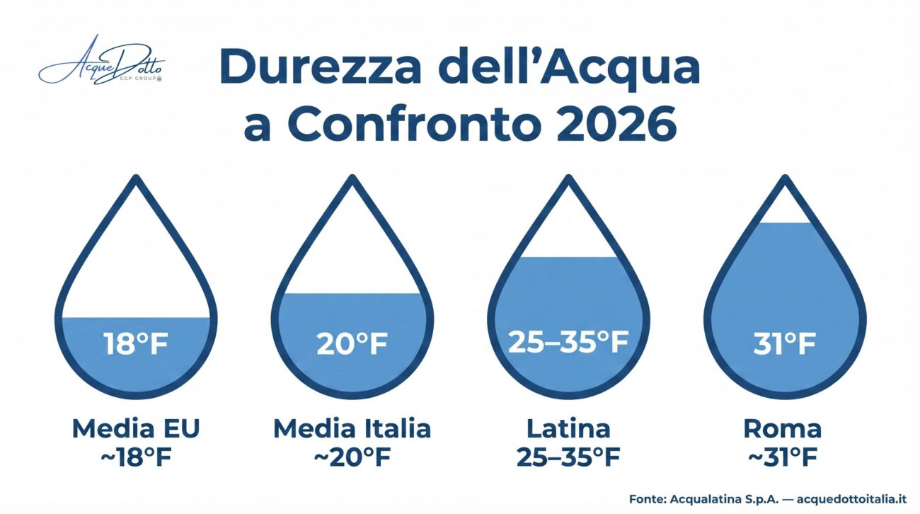 - 🪨 Durezza 25–35 °F — acqua dura, sopra Roma (31 °F), Milano (27 °F) e la media europea (~18 °F), gestita da Acqualatina S.p.A.
